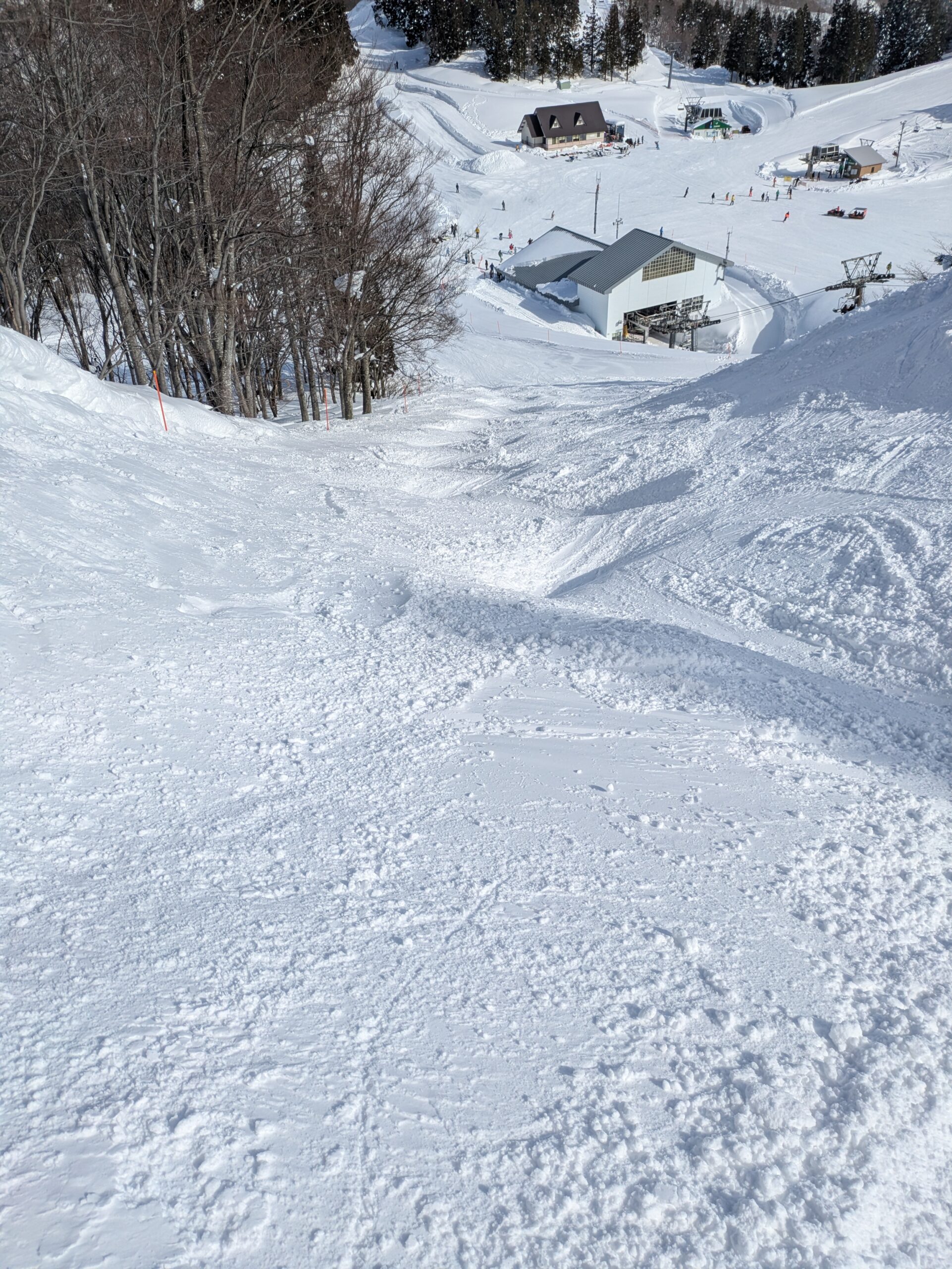 朝一番のゲレンデは整備されたフラットなバーンですが、多くの人が滑れば凸凹になってきます。